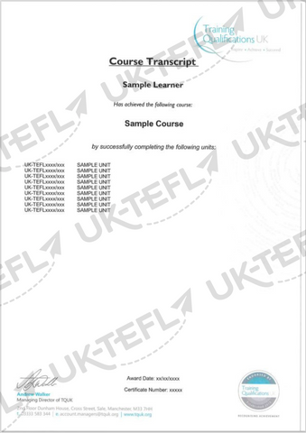 The certificate includes a registration/ certificate number and course module statement which is ideal for making yourself stand out when you are applying for TEFL jobs. If you have received a grade for your course submissions, please note this is not included as part of the TQUK certificate.